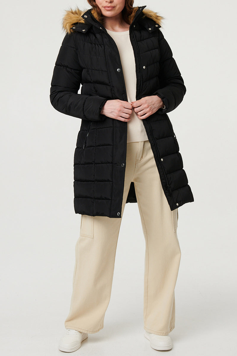 Faux Fur Trim Hooded Long Puffer Jacket with long sleeves, a zip and a high neck.