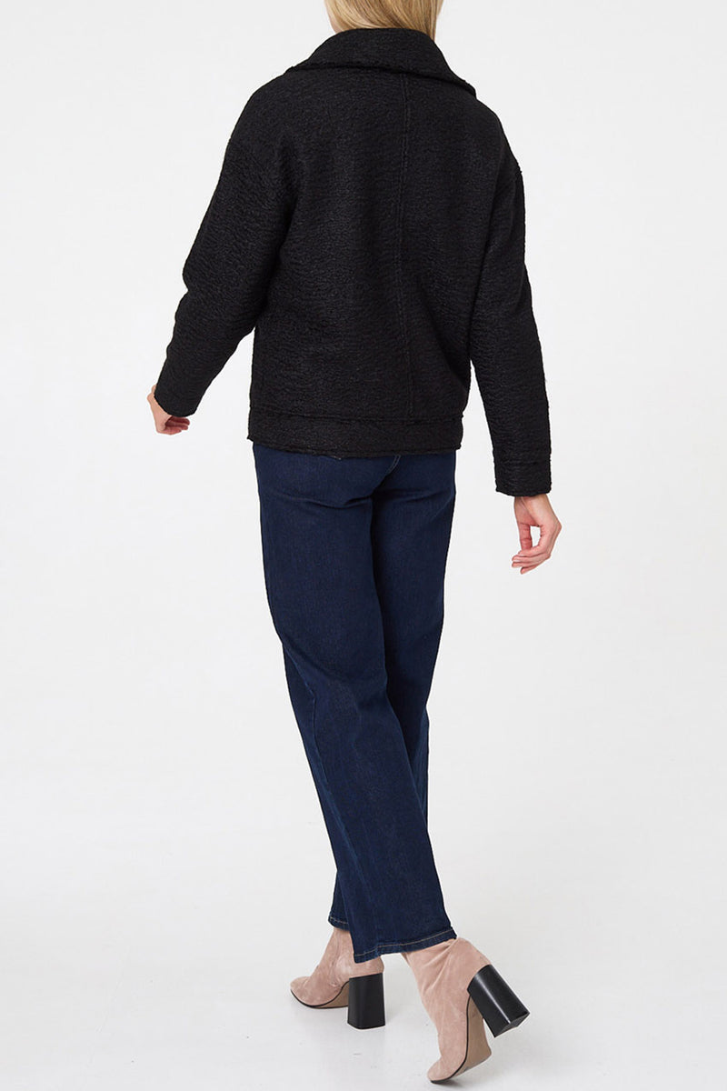 Teddy Textured Asymmetric Zip Jacket with a collar, a hip length hem and a boxy biker shape.