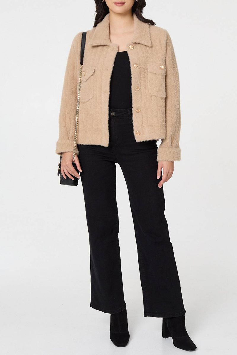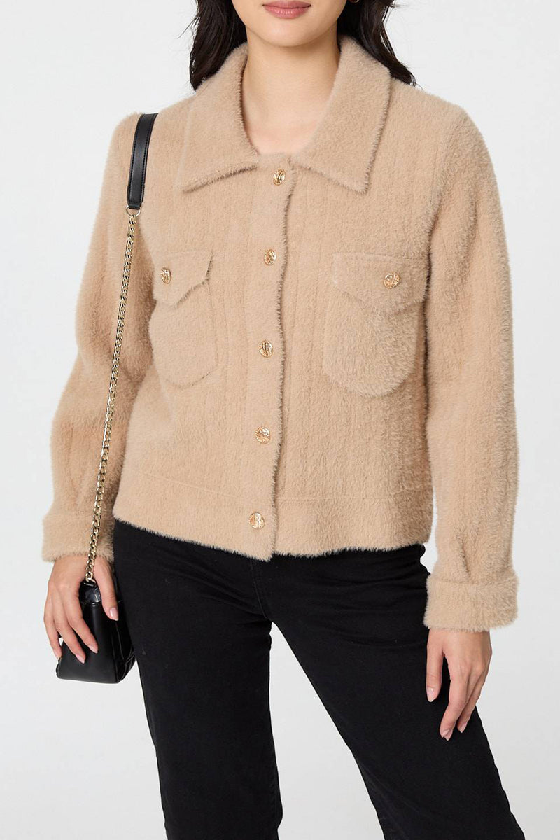 Soft Textured Button Front Boxy Shacket with long sleeves, metallic buttons and front pockets.