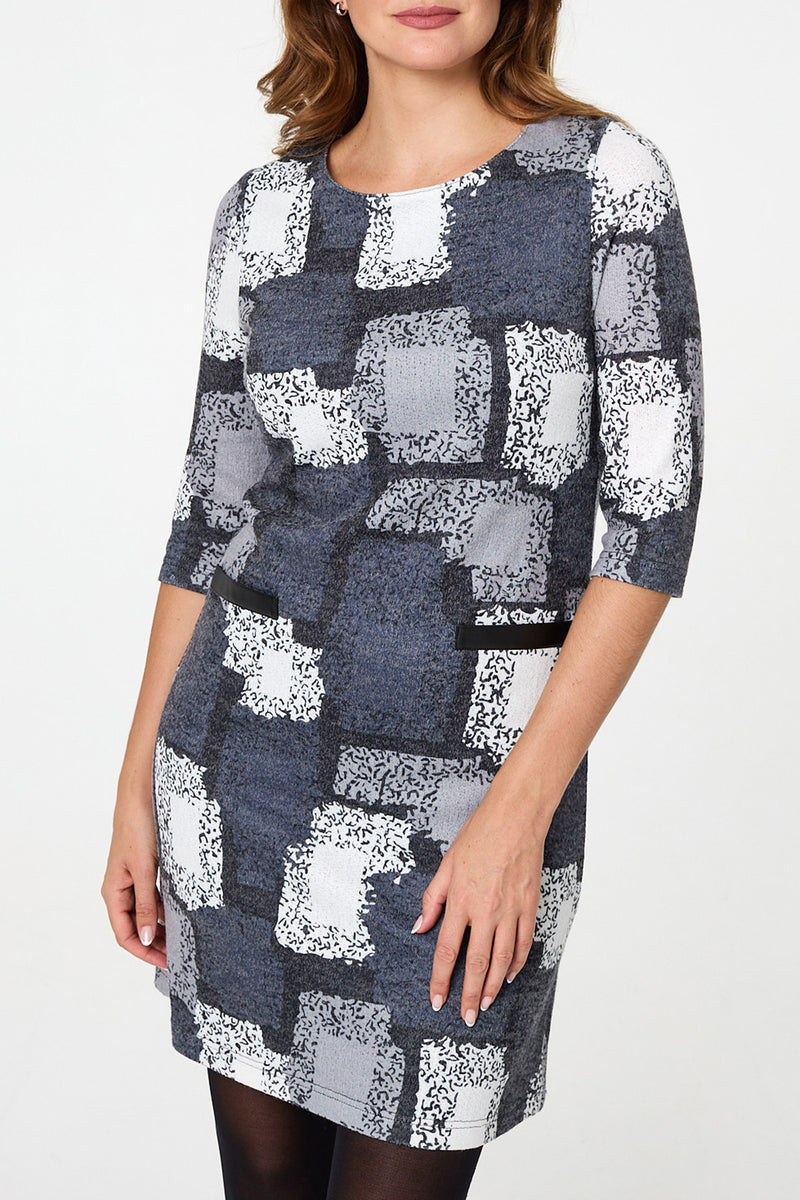 Printed 3/4 Sleeve Short Shift Dress with a round neck and pocket details.