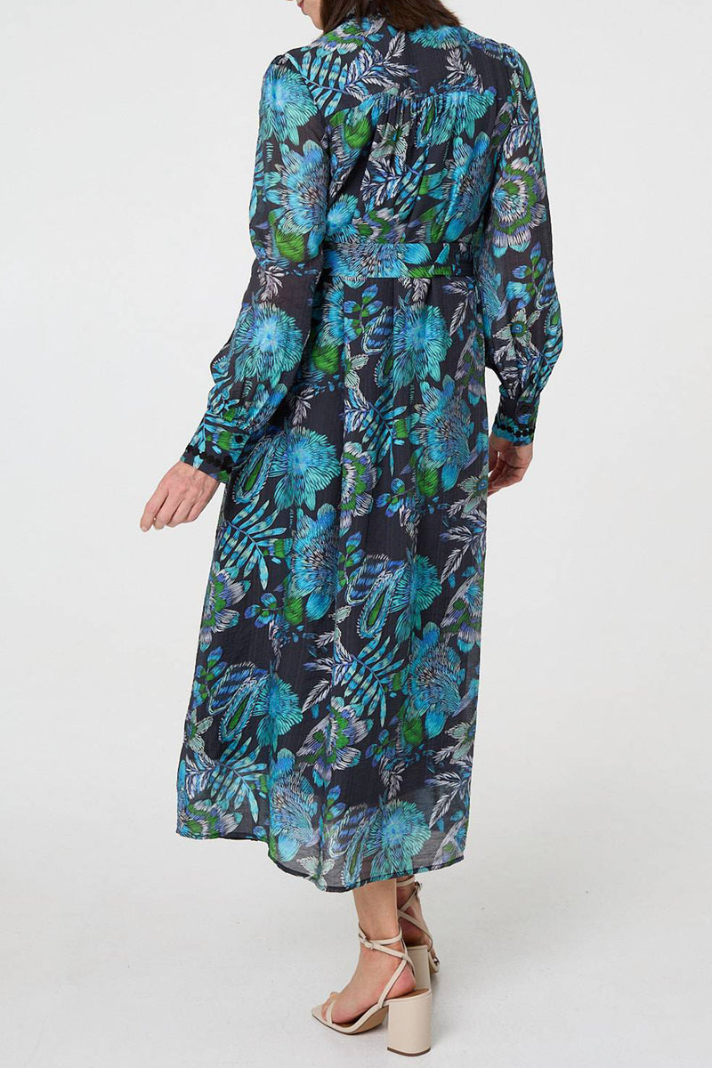 Floral Embellished Belt Midi Shirt Dress with a collar, buttons and a metallic belt detail.