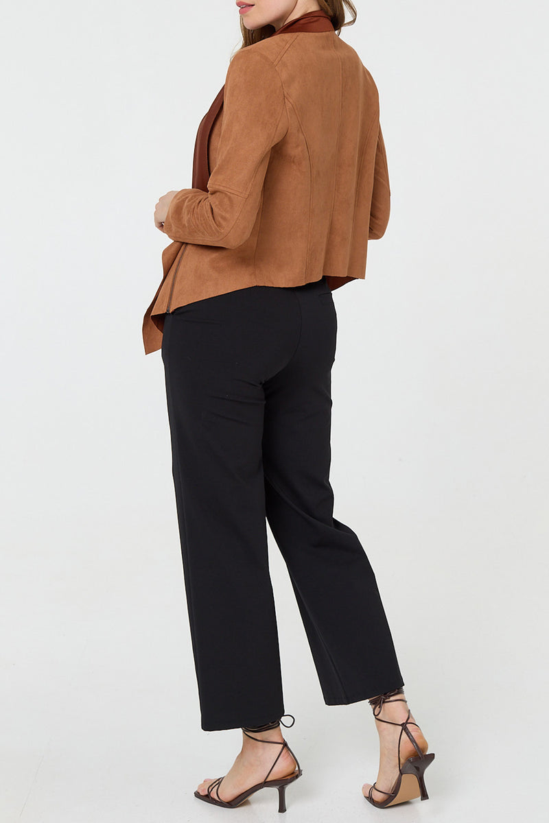 Contrast Lining Cropped Waterfall Jacket with soft suedette material, an open front and a curved hem.