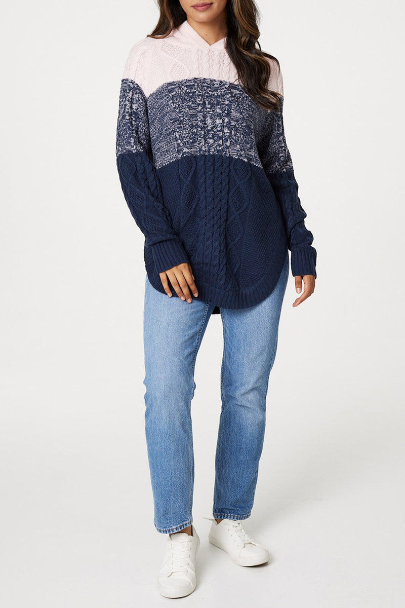 Colour Block Textured Knit Hooded Jumper with a v-neck, a curve thigh length hem and cable knit texture.