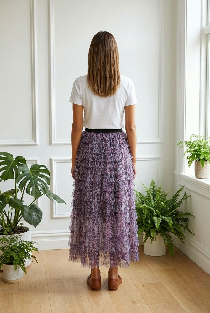 Animal Print Ruffled Mesh Maxi Skirt with a high waist and a semi sheer texture.