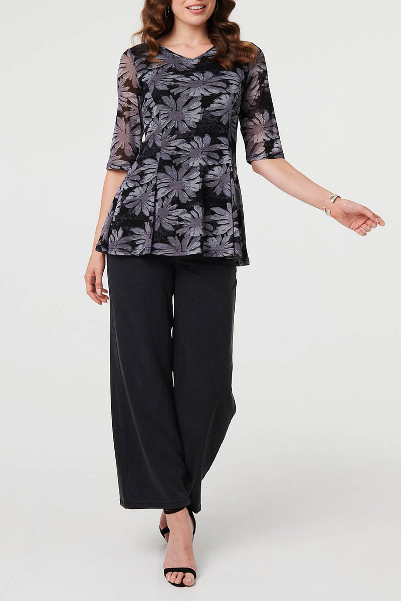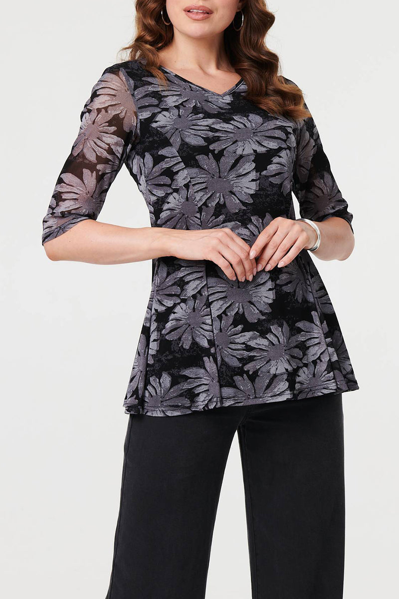 Floral Layered Relaxed Peplum Blouse with 1/2 sleeves, a semi sheer layer and a v-neck.