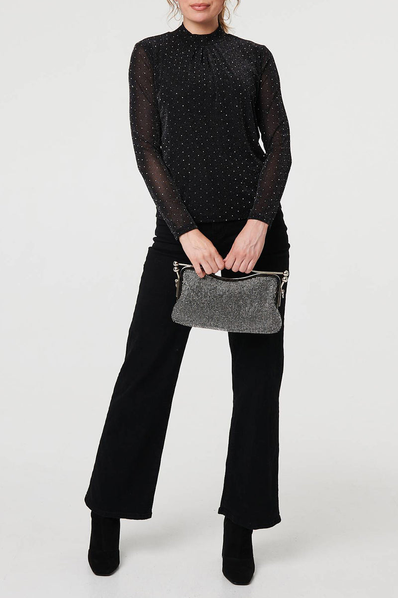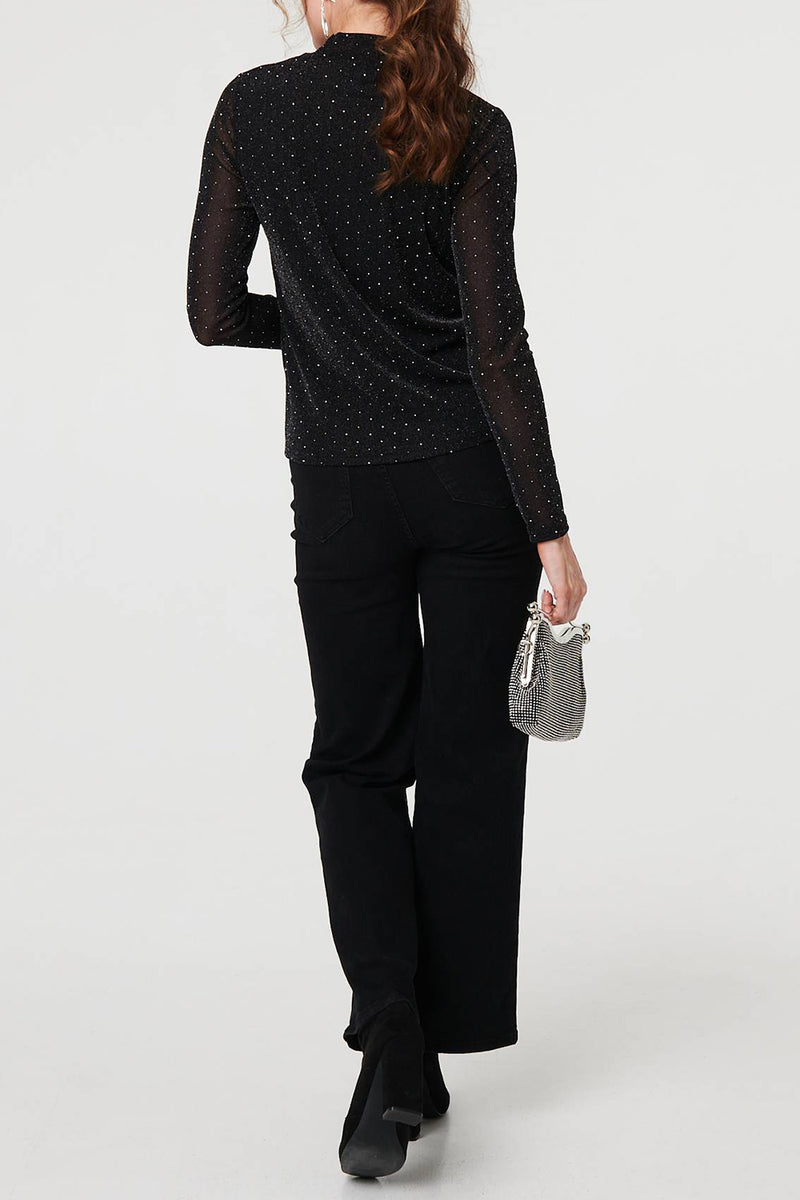 Sparkly Semi Sheer Long Sleeve Top with a high neck, a ruched detail and a hip length hem.
