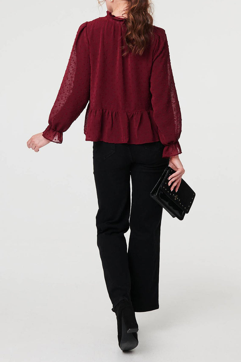 Semi Sheer Textured Ruffled Blouse with buttons, a tie neck and long sleeves.